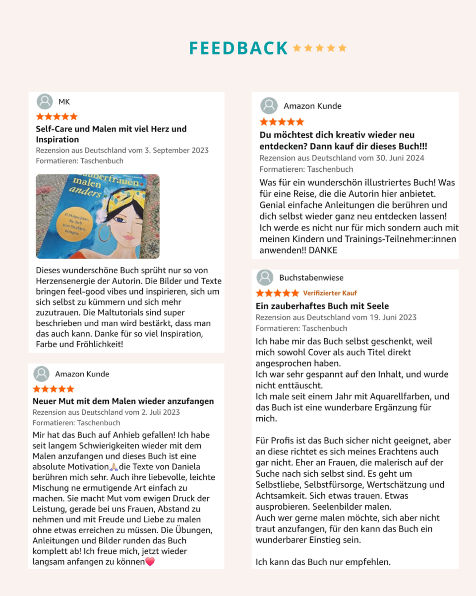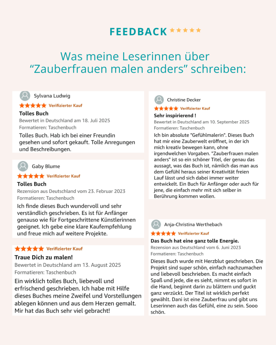 Dieses Buch begleitet Frauen seit 2022. Über 3600 Mal hat es seinen Weg bereits in kreative Hände gefunden. Für viele war es der Anfang zum regelmäßigen Malen.